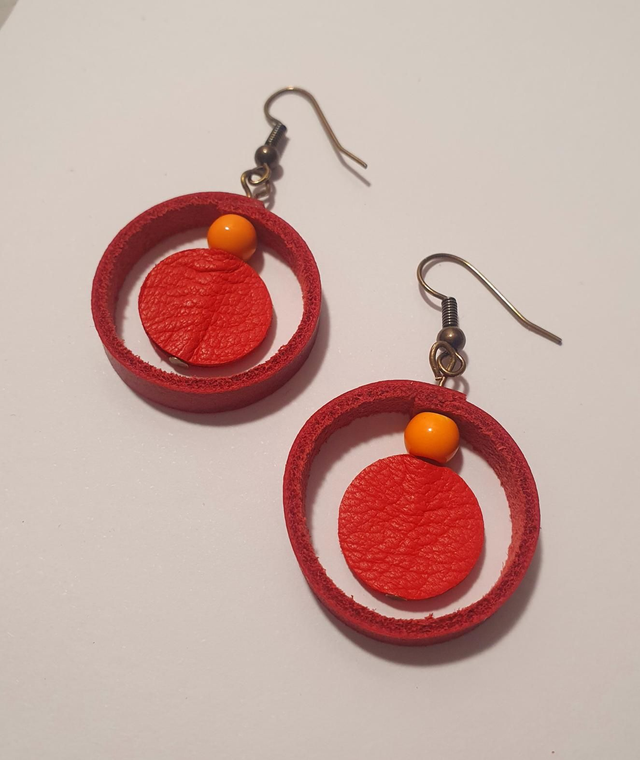 Boucles d´oreilles en cuir rouge bordeaux et rouge vif. Le tout agrementé d´une perle orange vif qui ramene du peps dans le look.